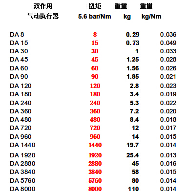 以雙作用氣動執行器為例(氣源壓力5.6bar時的數據表) OMAL(歐瑪爾) 能提供19個型號,扭矩從8Nm~8000Nm的雙作用執行器。扭矩范圍更廣,可選空間更大。執行器的重量比BETTIS輕35%